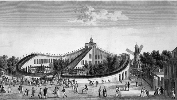 В 1812 году в Париже открылись первые в мире публичные русские горки. Французы не скрывали их происхождения: аттракцион назывался Les Montagnes Russes à Belleville, то есть «Русские горки в Бельвилле». В 1817-м у них появился конкурент — аналогичный аттракцион Promenades Aériennes («Воздушные прогулки») в парке Божон. Обе системы были не ледяными, а летними, с вагонетками, и в обеих было реализовано то, что отсутствовало в исходной русской конструкции, — цикличность. Катающаяся публика описывала круг и останавливалась в точке, откуда можно было быстро подняться к старту. Из Франции система перекочевала в Англию, а в 1840-х появились первые «железные дороги-центрифуги», то есть горки с замкнутой петлей. Той самой, которую полвека спустя запатентует американец Лайна Бичер.