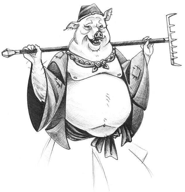 — О, великий монах Ли-сицинь, молю, ради ступней Нефритового императора, выслушай меня! В одном из перевоплощений я был очень плохим человеком, я грабил и убивал путников, продавая их товар и поедая их тела. Так что боги разгневались и превратили меня в свинью! Я был наказан ненасытным чувством голода, постоянно терзающим мое нутро. Мне нет прощения, но, быть может... ты позволишь мне идти с вами, защищая вас от всех напастей, и тогда я попробую честно заслужить великую милость: пусть мне подарят мучительную смерть с перерождением хотя бы в блоху, а?!
