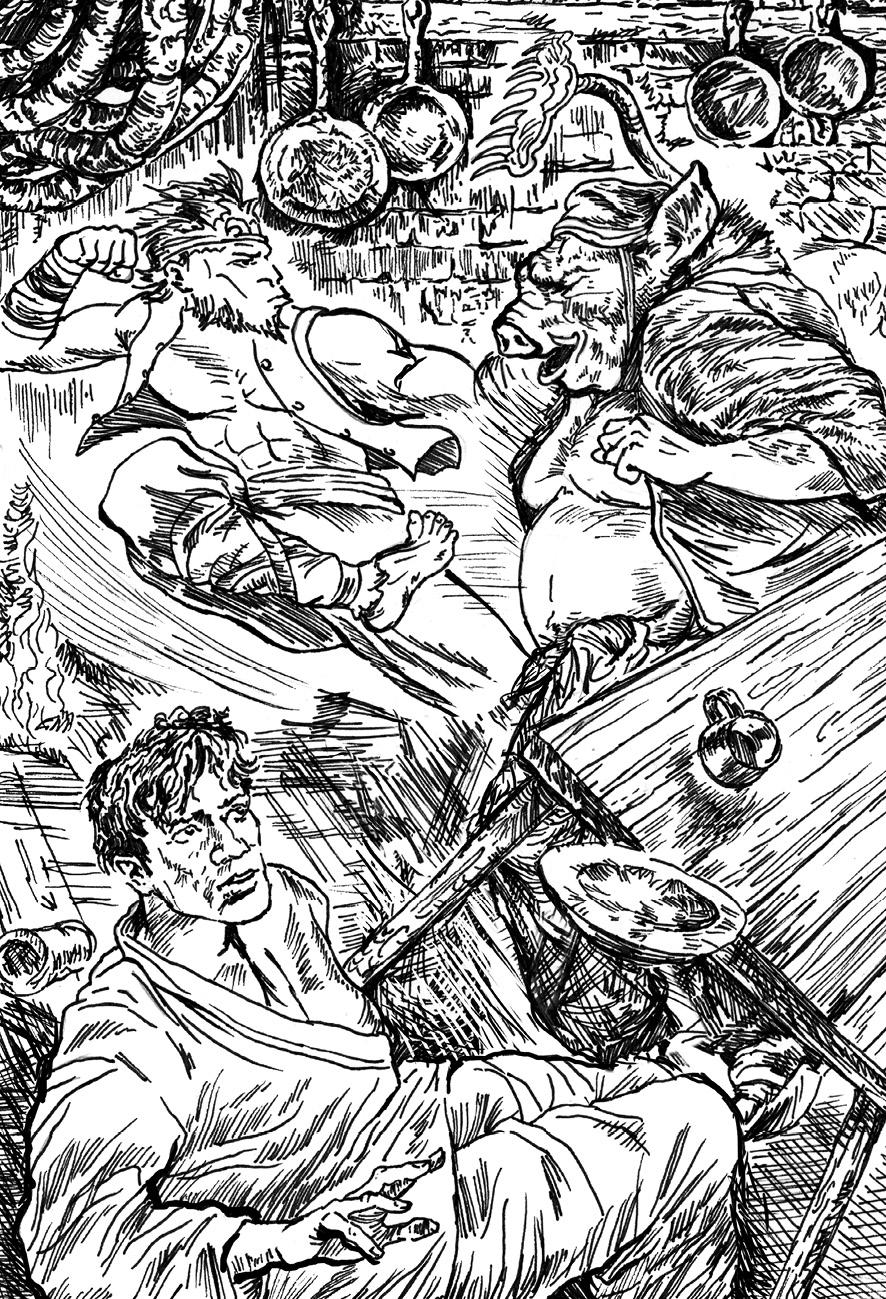 Все мясо на стенах обрело свой истинный вид. Теперь уже и я прекрасно видел копченые, вяленые и зажаренные трупы людей, один из которых прямо сейчас запекался над очагом. А сам толстяк вдруг затряс головой, его нос превратился в большой пятачок, уши вытянулись двумя треугольниками, из дырки в штанах сзади выпрыгнул закрученный хвостик, и перед нами встал человекообразный кабан, грозно щуривший маленькие, узкие глазки.
