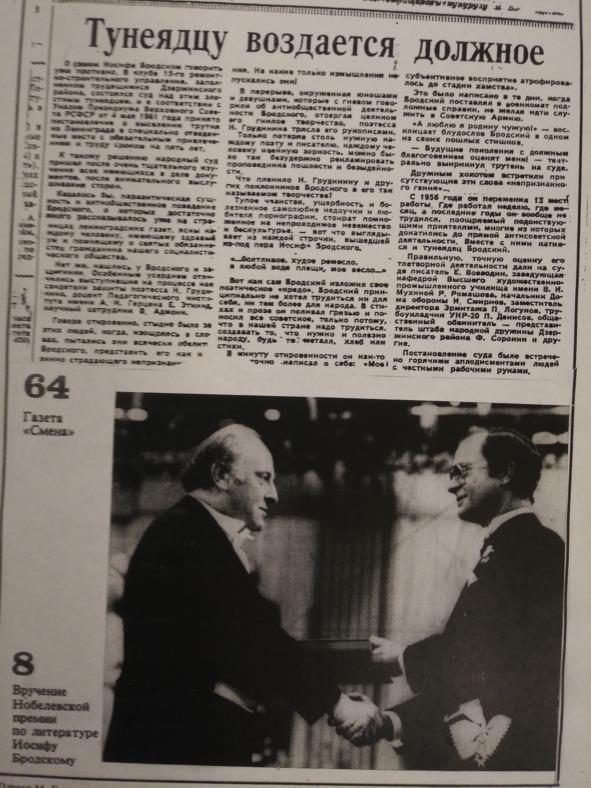 Я сделал большой плакат: на фото шведский король вручает поэту премию, а сверху факсимильно воспроизвел статью из газеты 64-го года о суде над ним с идеальным для плаката названием «Тунеядцу воздается должное…»