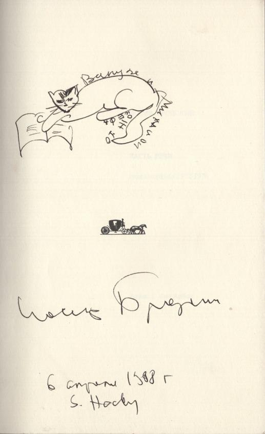 Мы с женой увиделись с Иосифом спустя 16 лет в его доме в Саут-Хедли. Он подарил нам книжки: «Урания», «Часть речи» и «Конец великой эпохи». На всех нарисовал кота, сделал трогательные надписи, на «Урании» написал: «Юле, Вике и Мишке от Жозефа по книжке. 6-е апреля 1988. S. Hadley. Иосиф Бродский».