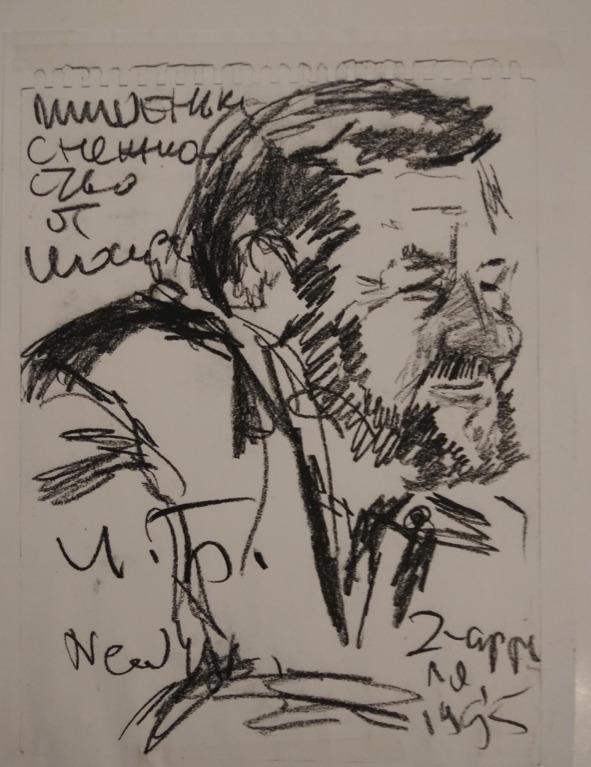 В Нью-Йорке мы были на его пятидесятилетии на Мортон-стрит, виделись на выставке Целкова, на выступлениях поэтов, Рейна, Кушнера, Наймана, которые он предварял, но чаще в уютном «Русском Самоваре» у Романа Каплана. 2 апреля 95-го года после выступления Бродского в Манхэттене мы пришли в «Самовар», Роман принес свой знаменитый альбом с автографами, фотографиями и рисунками и попросил меня нарисовать Иосифа, но тот забрал у меня альбом и любимый им цанговый карандаш: «Мишель, ты меня много рисовал. Дай-ка я тебя нарисую». И быстро сделал очень хороший рисунок. И написал: «Мишеньке, с нежностью от Иосифа. И. Б. Нью-Йорк 2 апреля 1995».