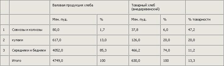 Она говорит, во-вторых, о том, что основными держателями товарного хлеба являются у нас мелкие и, прежде всего, средние крестьяне. Это значит, что не только с точки зрения валовой продукции хлеба, но и с точки зрения производства, товарного хлеба СССР стал, в результате Октябрьской революции, страной мелкокрестьянского хозяйства, а середняк — “центральной фигурой” земледелия.