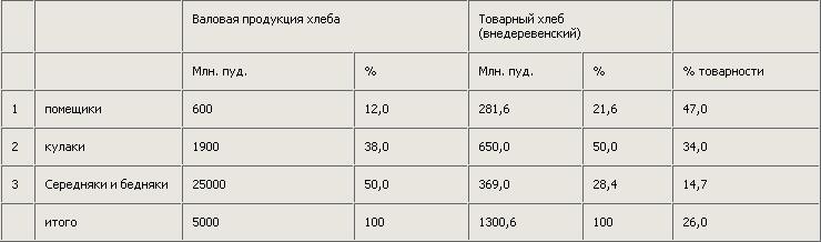 Вот вам несколько цифр, вскрывающих картину строения хлебного производства в прошлом, в довоенный период, и в настоящем, в послеоктябрьский период. Цифры эти даны членом коллегии ЦСУ т. Немчиновым. Они, эти цифры, не претендуют на точность, как оговаривается в своей записке т. Немчинов, — они дают возможность сделать лишь приблизительные расчеты. Но этих цифр вполне достаточно для того, чтобы понять разницу между периодом довоенным и периодом послеоктябрьским с точки зрения строения хлебного производства вообще и производства товарного хлеба в особенности.
