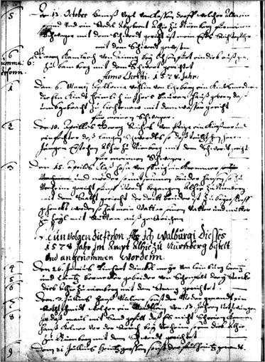 Страница копии дневника Франца Шмидта 1634 года, самой старой из сохранившихся версий, которая находится в Городской библиотеке Нюрнберга. Нумерация казней в левом поле, вероятно, была добавлена переписчиком
