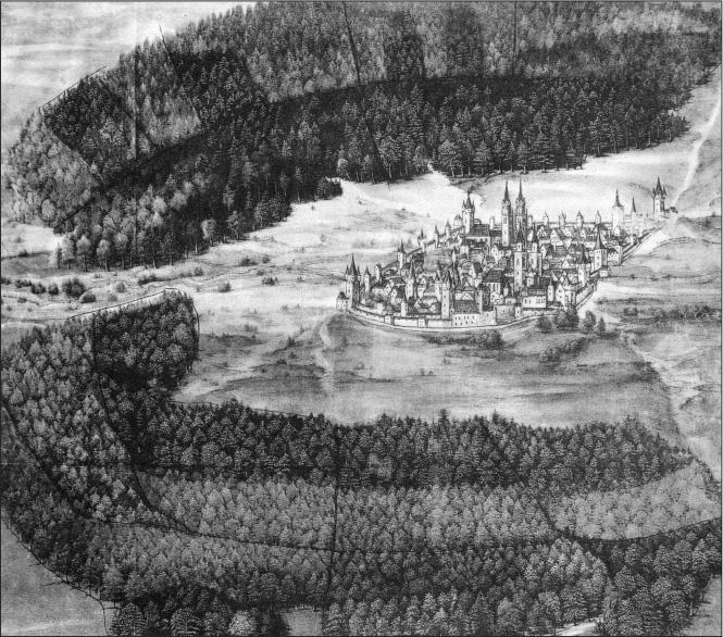Этот рисунок начала XVI века не зафиксировал бедные пригороды Нюрнберга, расположенные за пределами городских стен, но вполне передает характер города как крепости, призванной защитить горожан от угроз, исходящих из окрестных лесов (1516 г.)