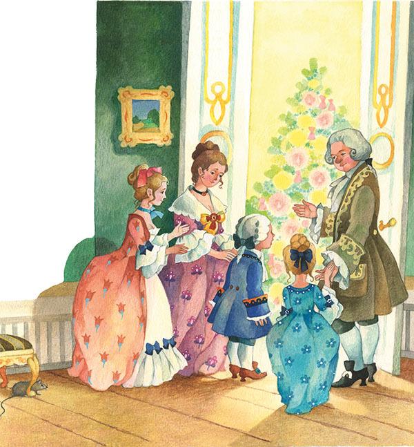 В ту же минуту раздался серебристый звон: «Динь-дон, динь-дон» – двери распахнулись, и из большой комнаты хлынул такой поток света, что Фриц и Мари в восхищении замерли на пороге.