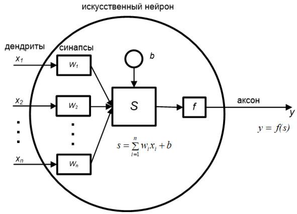 На рис. 1.1 S — результат суммирования (sum); wi — вес (weight) синапса, i=1,2,…,n; х — компонент входного вектора (входной сигнал),i=1,2,…,n; b — значение смещения (bias); n — число входов нейрона; у — выходной сигнал нейрона; f — нелинейное преобразование (функция активации).
