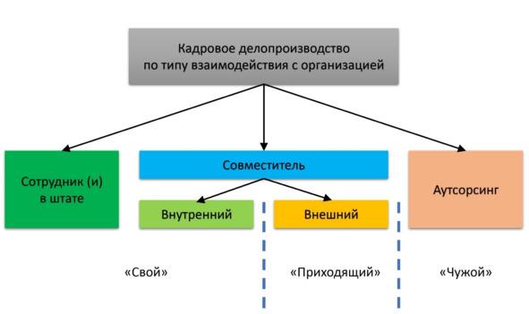 Различные формы взаимодействия при кадровом делопроизводстве можно сгруппировать в три основных типа: кадровик в штате, совместитель (внутренний или внешний) и аутсорсинг.