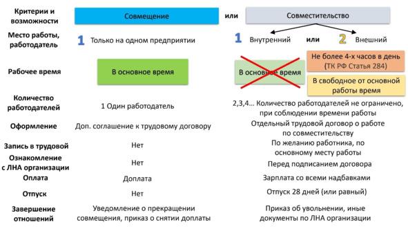 При организации работ работодатель с согласия работника может использовать инструменты совмещения или совместительства, основные отличия которых показаны на рисунке 2. Однако при выборе инструментов взаимодействия необходимо учитывать ограничения по совместительству1.