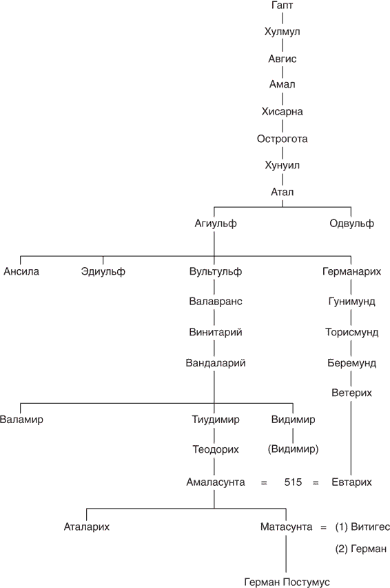 Этот эпизод известен из истории готов, или «Гетики», написанной неким Иорданом в Константинополе приблизительно в 550 г., и этот текст сыграл главную роль в современном понимании того, кем на самом деле был этот ребенок. Позднее, когда Теодорих уже прочно сидел на троне Италии, он любил говорить (особенно иностранным монархам) о своей принадлежности к исключительно «пурпурной» (то есть императорской) династии – gens purpura. Законность его собственной власти вытекала из того факта, что члены его рода безоговорочно правили готами на протяжении семнадцати поколений к тому времени, когда в 520-х гг. власть оказалась в руках его внука и преемника Аталариха. «Гетику» Иордана давно уже брали для предъявления веской повествовательной поддержки этого утверждения, и ее текст включал не только полную генеалогию рода Теодориха Амала (схема на с. 25), но и множество рассказов о некоторых его наиболее выдающихся представителях[7].