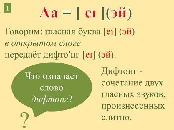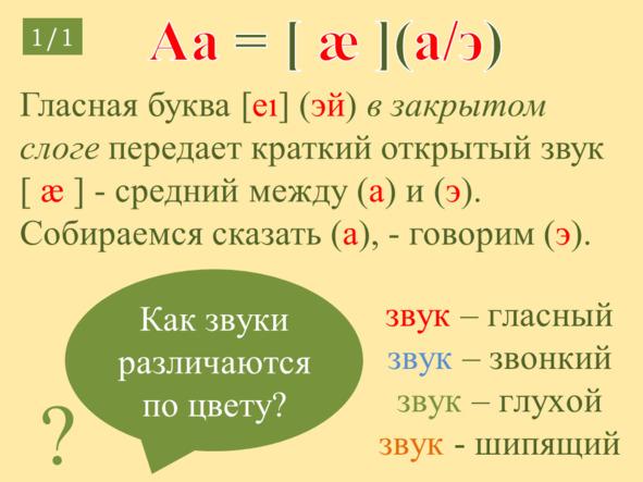 A: Я гласная буква Aa (эй). Когда слово оканчивается на согласный звук, я пою песенку [æ] (а/э) Звук [æ] (а/э) — гласный и носит красную одёжку.