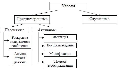 Угрозы подразделяются на преднамеренные (связанные с целенаправленными действиями нарушителя; в качестве нарушителя могут выступать служащий, посетитель, конкурент, наемник и т.д.) и случайные. Причинами случайных воздействий могут быть аварийные ситуации из-за стихийных бедствий и отключений электропитания, отказы и сбои аппаратуры, ошибки в программном обеспечении, ошибки в работе обслуживающего персонала и пользователей, помехи в линиях связи из-за воздействий внешней среды.