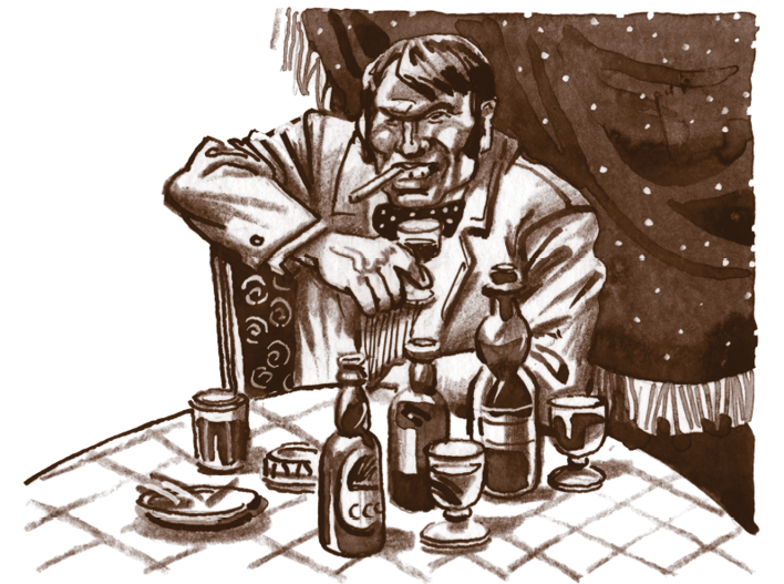 Было уже около семи часов вечера. Педро Альварес в это время обычно ужинал в «Тезору» [24] — в одном из кабаков, где просиживал до поздней ночи. Туда и повел Смуга своих друзей. Вскоре они очутились у входа в одноэтажный домик; из-за тяжелых желтых занавесок, висевших на окнах, доносились оглушительные звуки музыки.