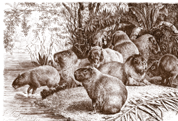 Самый большой и массивный представитель из всего отряда грызунов — водосвинка (Hydrochoerus capybara), напоминающая по сложению и щетинистой шерсти свинью. Это животное длиной до 1,5 аршина [1,07 м. — Примеч. ред.] 〈…〉 водится по всей Южной Америке, по берегам рек и озер. Малые уши, расщепленная верхняя губа, отсутствие хвоста, короткие плавательные перепонки между пальцами ног (3-мя на задних и 4-мя на передних), крепкие копытообразные когти, а также большие резцы, по крайней мере 2 см ширины, наконец, грубый, редкий мех неопределенного цвета — неясно-бурого с оттенком рыжего и желтоватого — таковы характерные признаки водосвинки. Движутся они медленно, иногда прыжками, напротив, плавают превосходно. 〈…〉 По характеру водосвинка очень смирна и спокойна, а по душевным способностям — крайне тупое существо. (А. Брэм. Жизнь животных, т. 1.)
