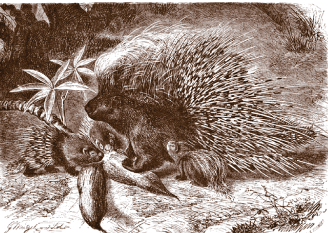 Дикобраз живет уединенно, днем отдыхает в длинных, низких ходах, которые вырывает себе в земле, ночью же выходит на добычу. Все движения его медленны и неуклюжи. Если его захватят неожиданно, то он грозно выпрямляет голову, топорщит свои иглы и гремит ими, особенно полыми иглами хвоста, так что происходит страшный шум, действительно способный напугать неопытного человека. При сильном раздражении дикобраз ударяет задними ногами о землю, а если схватить его, то издает глухое хрюканье, подобно свинье. При этом движении некоторые иглы выпадают, что и послужило поводом к распространению сказки, будто он стреляет во врага своими иглами. Между тем на самом деле это совершенно беспомощное, безобидное создание, которое легко захватить, если быть поосторожнее с иглами. (А. Брэм. Жизнь животных, т. 1.)