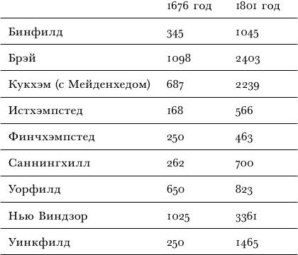 По крайней мере, так считалось в теории. На практике дело обстояло сложнее. Споры из‑за прав и притязаний испокон веков сопровождали жизнь в лесу. С одной стороны, знать и местное дворянство издавна по кусочку отгрызали земельные владения и продолжали это делать: здесь — маленький частный парк с оленями, там — пруд с правом частной рыбной ловли, тут — исключительное право на поместную землю. Иногда такие притязания основывались на пожалованиях или иных доказательствах благосклонности прежних монархов [54]. С другой стороны, арендаторы поместий по манориальному обычаю при каждом удобном случае выдвигали свои собственные претензии на неограниченный выпас скота, заготовку древесины и торфа на общинных участках [55]. И наконец, в лесу существовала проблема незаконных поселенцев и приезжих, не имеющих никаких официальных прав, но претендующих на то же, чем обладают соседи. Весьма вероятно, что в первые десятилетия XVIII века население леса увеличивалось, и до этого оно также росло в течение почти ста лет. Сколько-нибудь надежных цифр не существует, приходится довольствоваться косвенными данными. В 1640 году петиция большого жюри Беркшира гласила, что «свободные люди» вынуждены из страха перед вербовщиками покидать свои дома и скрываться в лесах [56]. Некоторые, возможно, там и остались. Другие (в основном старые солдаты Кромвеля) могли поселиться в лесу, когда при Английской республике Большой парк Виндзора был разделен примерно на тридцать ферм; но их права аренды, конечно, не пережили Реставрацию [57]. Явно выросло население северо-восточных районов леса, вокруг Мейденхеда, Брэя, Кукхэма и Виндзора, где особенно густо расселилось дворянство со своей прислугой и различными службами [58]. Но из «Судебных книг вердереров» (судебных чиновников, обеспечивающих закон и порядок в королевских лесах) явствует, что незаконные поселения и мелкие огораживания непрерывно продолжались также и в глубине леса: только в 1687 году касательно одного лесного массива, Беарвуд, были поданы исковые заявления за незаконное поселение примерно на «шесть или восемь десятков» крестьян [59]. Другие лесные приходы, при растущем налоге в пользу бедных, отчаянно пытались не допустить появления новых поселенцев [60]. Численность жителей лесных районов (несколько уменьшившихся по площади) в 1801 году оценивалась в 17 409 человек [61]. Сопоставимых цифр за 1720‑е годы не существует, но, как бы то ни было, можно сравнить цифры по отдельным лесным приходам в «Комптонской» переписи прихожан 1676 года с данными переписи 1801-го, чтобы отметить тенденцию к росту [62].