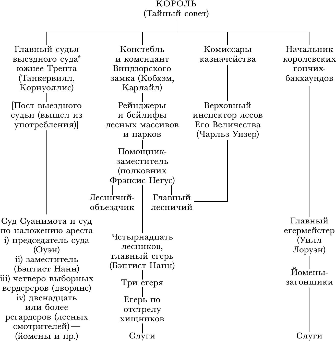 То было последним свидетельством деятельности выездного суда. Но, в истинном стиле XVIII века, должность выездного судьи оставалась источником привилегий и льгот, даже если функции суда прекратились. Эти бонусы включали в себя право выдавать (но фактически продавать [80]) лицензии на охоту в королевских лесах на всю дичь, кроме оленей [81]. Выездной судья также мог каждый год забирать некоторое количество оленей для собственного использования, и у него была власть выдавать (или продавать) ордера и лицензии на вырубку деревьев и на огораживание или строительство в лесу [82]. В остальном обязанности выездного судьи, по-видимому, сводились к периодической рассылке воззваний из Лондона и к получению жалованья в размере 1500 фунтов стерлингов. Должность обычно доставалась не юристу, а царедворцу, и главный выездной судья (по словам одного наблюдателя) «обычно являлся должностным лицом, обладающим более знатностью, чем знанием законов леса» [83].