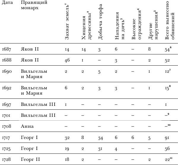 Фактически в лесу предвидели неудовольствие короля. Первые свидетельства ужесточения правил в отношении лесов стали заметны еще в предыдущем году. Было назначено новое лесное начальство, в основном из вигов, во главе с очень богатым военным авантюристом виконтом Кобхэмом. Когда в июне 1717 году умер заместитель Кобхэма, то полковника Негуса (который уже занимал несколько лесных постов) назначили вместо него [102]. Разумно предположить, что Негус, член парламента от Ипсвича, а также исполняющий обязанности королевского конюшего, являлся союзником Таунсенда [103], Уолпола и крайних вигов, сторонников Ганноверской династии [104]. Непосредственный эффект перемен можно оценить по количеству обвинений против правонарушителей в суде по наложению ареста или в уже упоминавшемся Сорокадневном суде. После последнего (и единственного) заседания суда Суанимота в правление Анны этот суд продолжал время от времени собираться, иногда предъявляя обвинения в захвате земель, вырубке леса без лицензии и т. д. С тех пор суд почти прекратил свою деятельность вплоть до апреля 1716 года, а с этого момента количество предъявленных обвинений резко возросло. Если на заседании суда Суанимота в 1708 году не было утверждено никаких обвинительных актов против лесных нарушителей, то на следующем заседании (1717), когда король Георг впервые посетил лес, вынесли девяносто одно обвинение. Большинство из них были представлены в суд по наложению ареста, поспешно созванный за три недели до визита короля: двадцать два обвинения вынесли за добычу вереска и торфа, тринадцать за захват участков, десять за неразрешенное строительство коттеджей или других зданий, пять за слишком высокие ограждения, препятствующие проходу оленей (в том числе Роберту Эдвардсу, нарушителю прав короля в Уинкфилде), четыре за нарушения при выпасе овец и одно за содержание борзых собак. С 1717 по 1725 год количество обвинительных постановлений поддерживалось на высоком уровне. Позднее их число сократилось [105]. (См. таблицу, с. 60.)