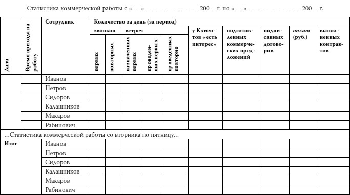 Получается, что причина низких результатов у большинства менеджеров по продажам не столько в том, что они недостаточно квалифицированно проводят переговоры, сколько в том, что они делают слишком мало звонков и встреч! Поэтому статистику работы сотрудников – сколько они делают первых и повторных звонков, первых и повторных встреч и какой «выхлоп» идет от этих звонков и встреч – нужно отслеживать постоянно. Для этого есть специальная отчетно-контрольная форма – «Статистика коммерческой работы».