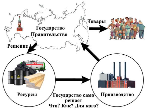 Вспомни, какие три основных вопроса решает экономика. Вспомнил, конечно. Это «что?», «как?», «для кого?». Значит, получается, что государство при командной экономике постоянно указывает всем людям в стране, в том числе и тебе, что делать, как делать и для кого делать. Государство само распределяет все ресурсы и товары.