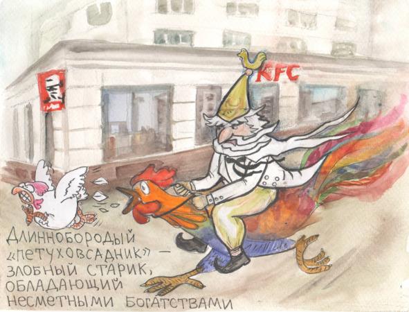 Длиннобородый, петуховсадник — маленький прожорливый старичок ростом с аршин, с длинной бородой, ездящий верхом на петухе, живёт в подземелье в своём дворце, владеет несметными богатствами, держит в плену похищенных женщин.