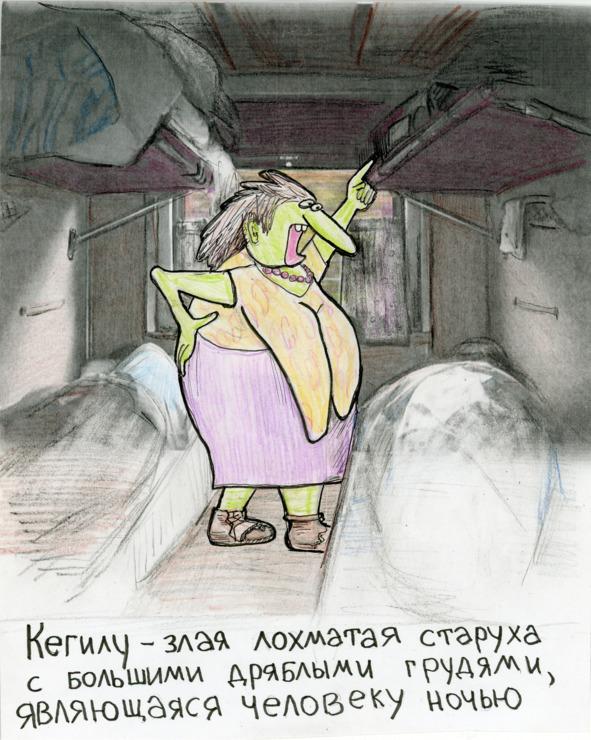 Кегилу — злая старуха в лохмотьях с большими дряблыми грудями, распущенными волосами, обутая в черепки глиняной посуды, иногда является в образе кошки, по ночам она наваливается на спящего человека и душит его. Кегилу можно приручить, схватив её ожерелье.
