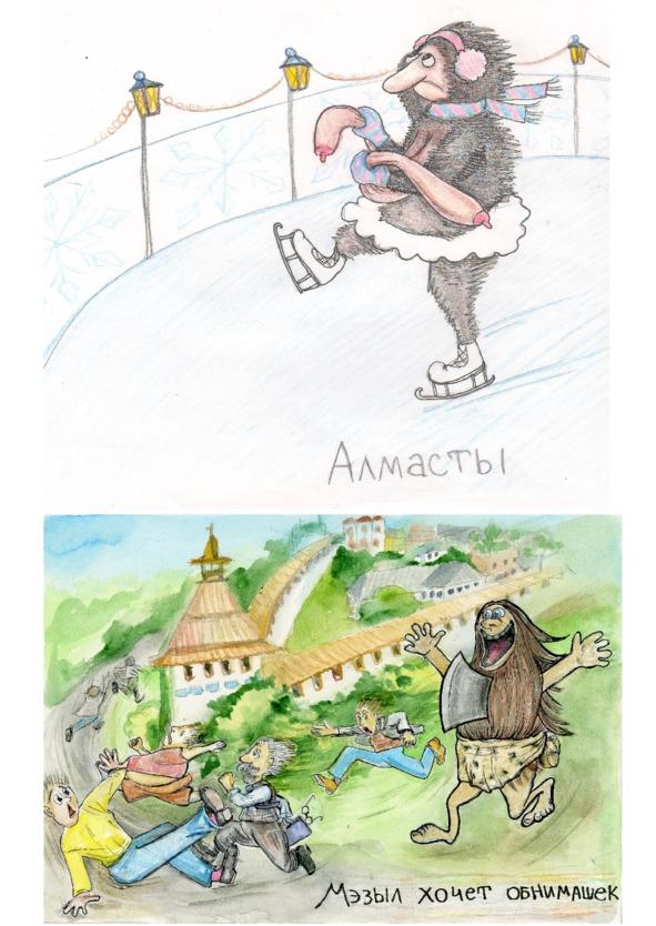 Алмасты — лесное лохматое существо в форме уродливой огромной женщины с отвислыми грудями, она охотится на мужчин и склоняет их к связи, а когда рождает ребёнка, ходит по селу с криками и плачем: «Я родила младенца, он голенький, оденьте мне его». По поверьям, если вырвать волосок с головы алмасты, то она всю жизнь будет прислуживать в доме, пока не найдет свой волосок.