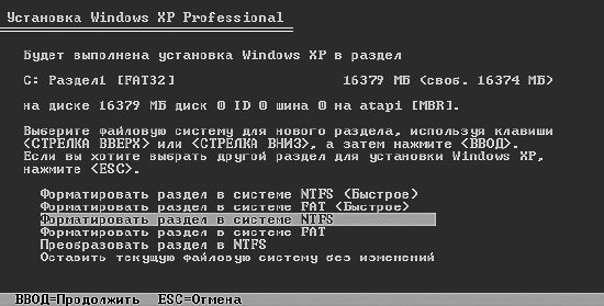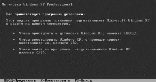 Здесь стоит подумать, что делать дальше: продолжить установку, восстановить то, что стояло на компьютере, или вообще выйти из программы установки. Но не зря же мы на целый вечер отказались от всех прелестей жизни, чтобы вот так все закончить разом. Конечно же, будем продолжать установку. Жмем Ввод или Enter (не у всех на клавиатуре одинаковые клавиши).