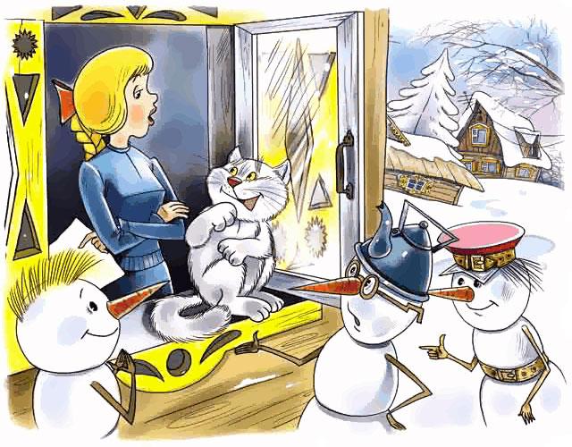 Снегурочка выглянула в окно и увидела собравшихся перед домом снеговиков.