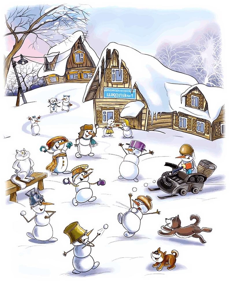 — Не снеговики, а грязевики какие-то, — сердилась Снегурочка, оглядывая перепачканных помощников. — А ну-ка быстро оттираться чистым снегом!