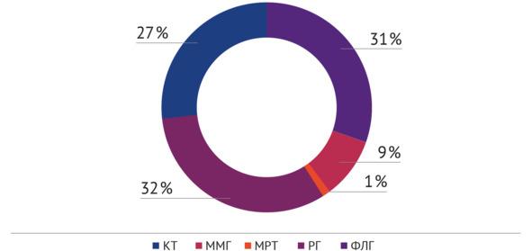 Всего ИИ-сервисами проанализированы результаты 2 603 669 лучевых исследований, в том числе результаты КТ и НДКТ – 34,0% (890 145), ММГ – 8,0% (213 528), МРТ – 5,0% (120 713), РГ – 49,0% (1 264 614), ФЛГ – 4,0% (114 669).