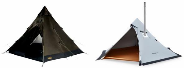 Рисунок 1.16. Палатка-пирамида. Справа — небольшая конструкция. Слева — оборудованная дровяной компактной печкой.