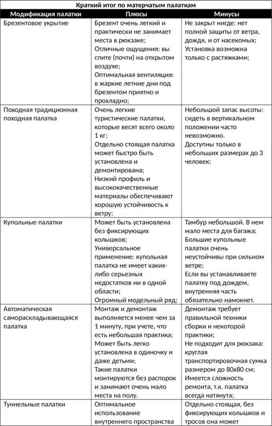 Существует несколько видов палаток. Самой простой и легкой конструкцией для автотуризма является брезентовое укрытие. Оно представляет собой водоотталкивающее полотно с петлями для крепления растяжек. Ткань натягивается между 2 деревьями и землей, и все что нужно сделать, — это прикрепить углы брезента к земле. В зависимости от местоположения, погоды и желаемого размера, существует множество способов установки такого укрытия, которое даст вам крышу в течение нескольких часов. Но не более того: брезент открыт со всех сторон и не защищает от насекомых и переменчивых ветров. Благодаря своему легкому весу и быстрой установке, такое укрытие идеально подходит для людей, которым необходим отдых на несколько часов вне автомобиля.