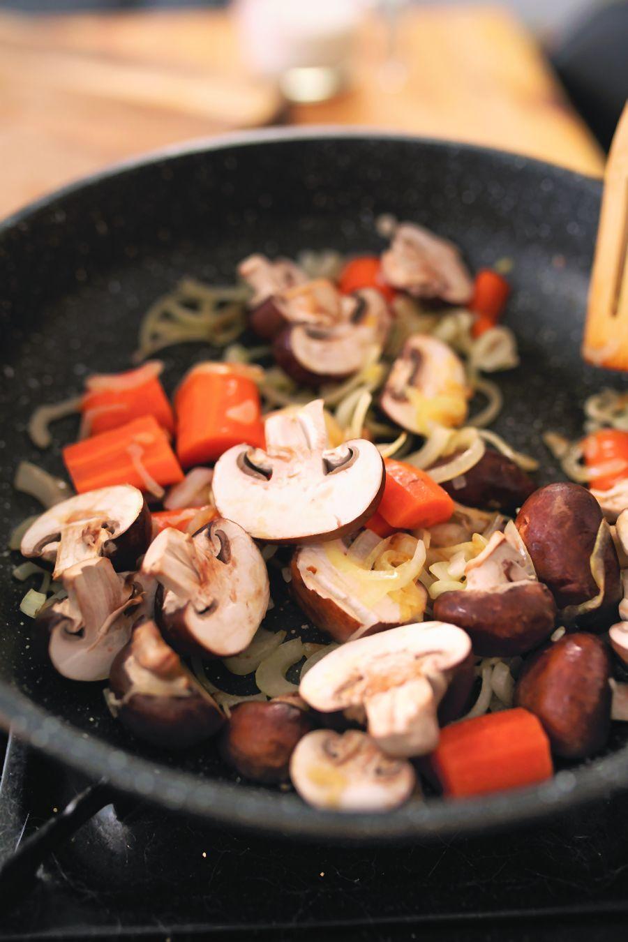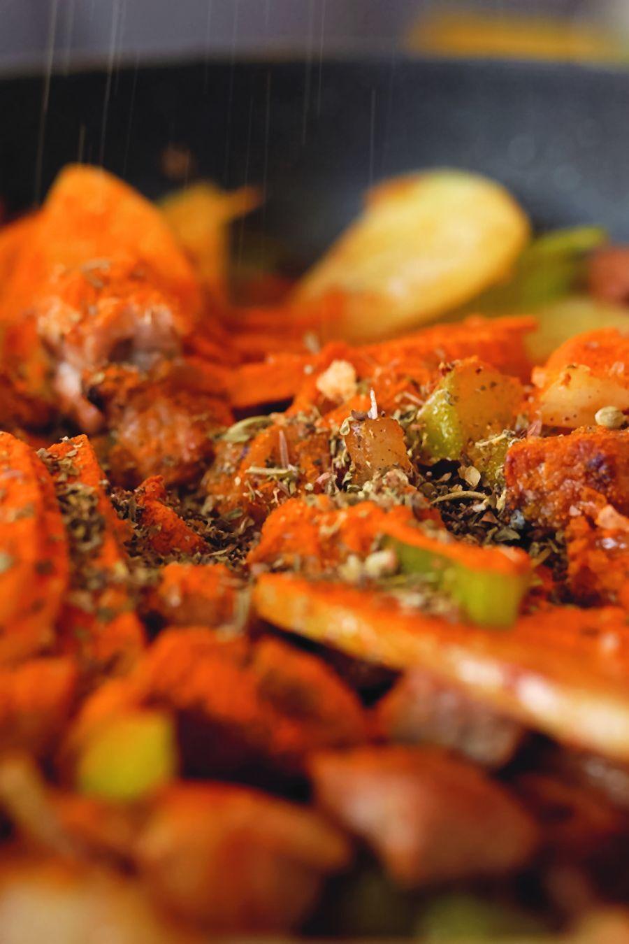 ♦ На той же сковороде жарим овощи на среднем огне. Начинаем с лука, чтобы он успел хорошо обжариться, а не свариться, если на сковороде будет слишком много ингредиентов. Затем добавляем болгарский перец и картофель, перемешиваем и еще слегка обжариваем.