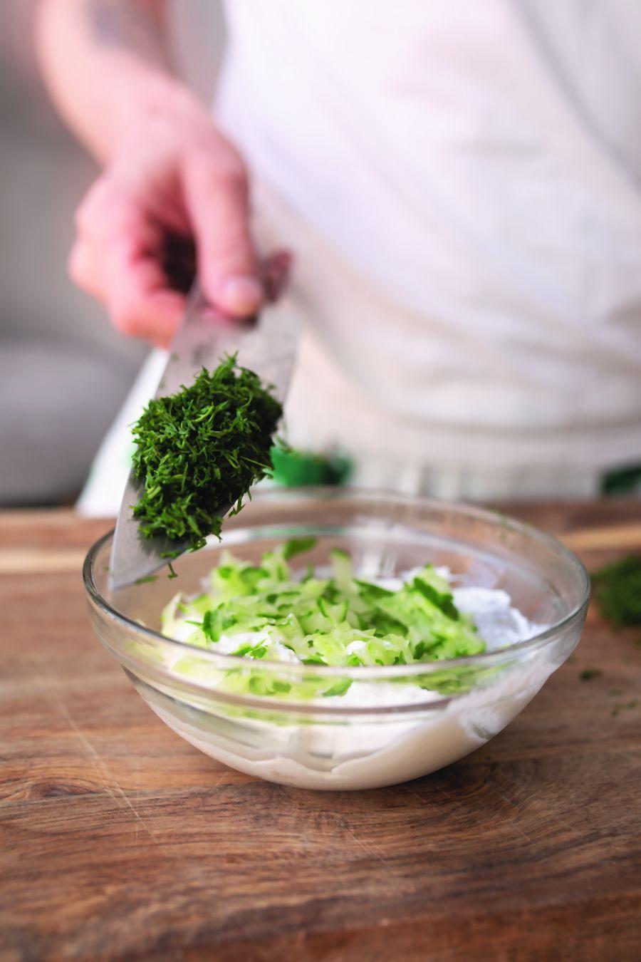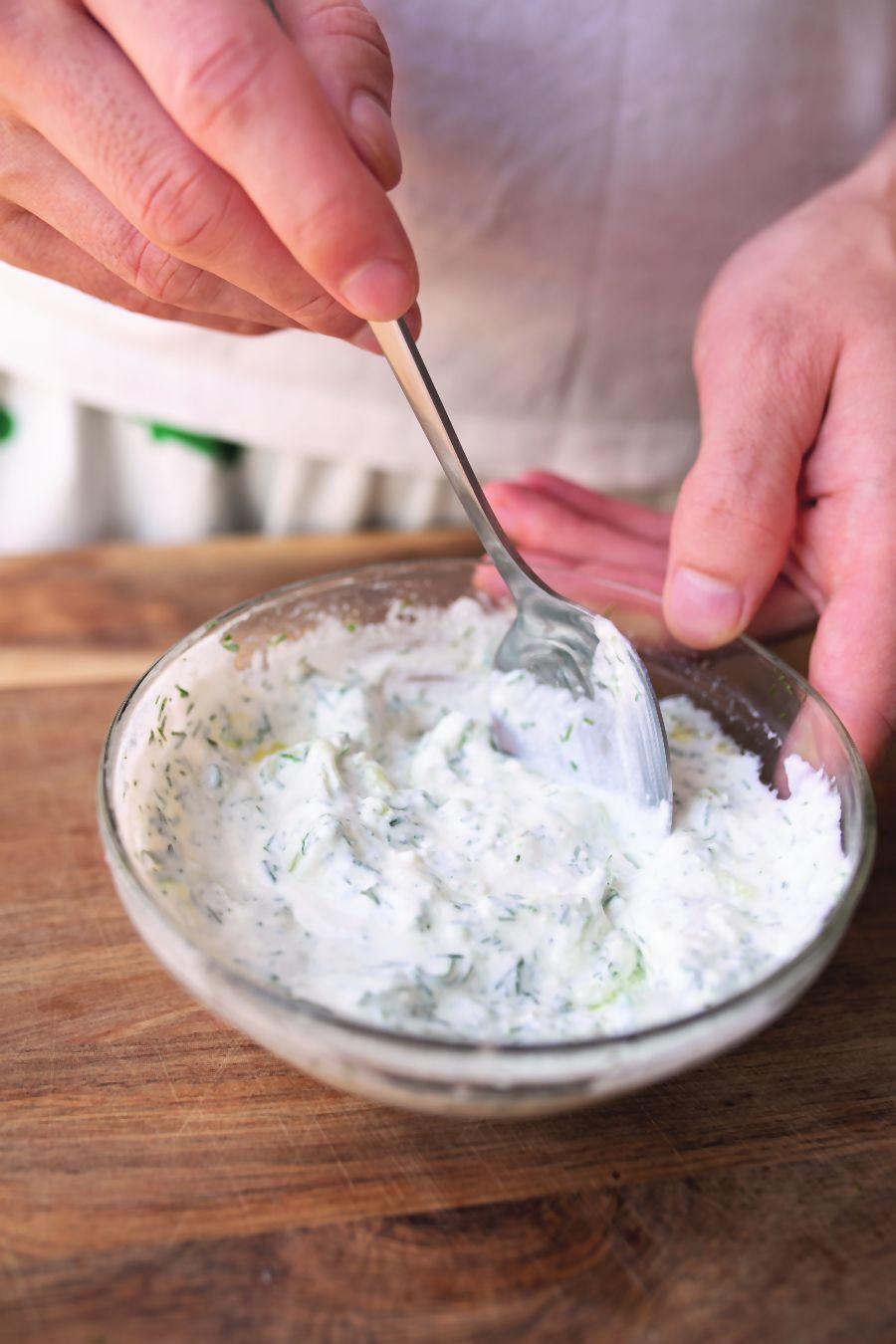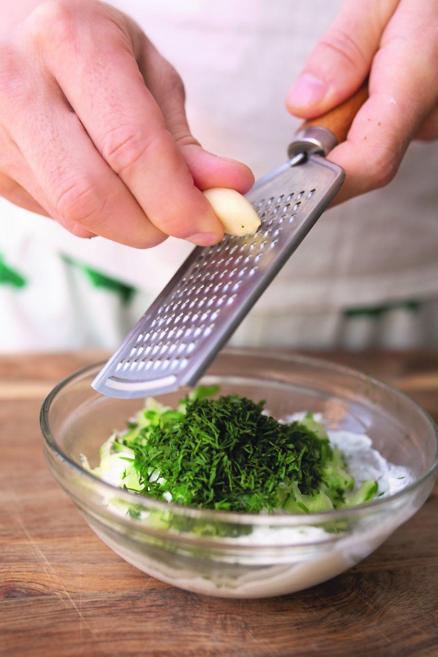 ♦ Добавляем укроп и тертый огурец в миску к греческому йогурту или сметане. Добавляем туда же 1–2 тертых зубчика чеснока, соль и перец по щепотке, немного оливкового масла и сок половинки либо четвертинки лайма (в зависимости от его размера). Лучше добавить поменьше, хорошенько все перемешать, попробовать и уже тогда отрегулировать. По настроению можно добавить еще немного цедры лайма на терке.