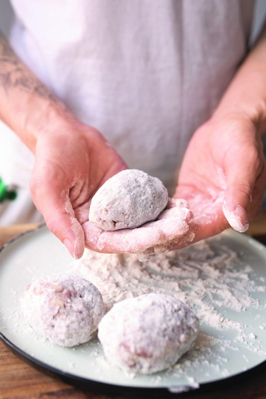 ♦ Обваливаем шарики в муке, взбитом яйце и в панировочных сухарях.
