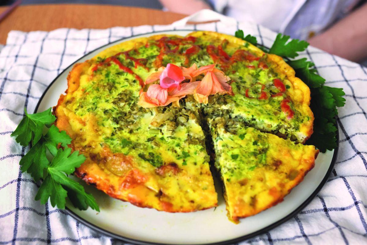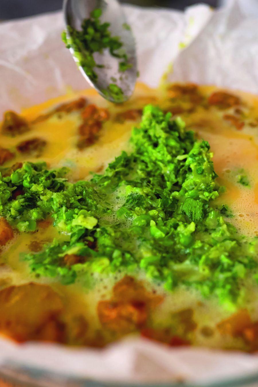 ♦ На дно подходящей круглой формы кладем пергамент и слегка смазываем его маслом. Выкладываем в форму готовое рагу и заливаем поверх, ближе к краям, яичной смесью. В центр выкладываем зелёную часть и красиво смешиваем по краям.