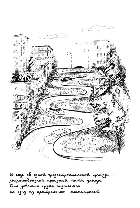 И еще об одной градостроительной причуде — зигзагообразной проезжей части улицы. Она довольно круто спускается на одну из центральных магистралей, по которой движутся открытые с боков туристические трамвайчики, и имеет на стометровом марше восемь поворотов на 180 градусов! Чтобы проехать ее сверху донизу, надобно умение водить автомобиль в экстремальных условиях, проявляя виртуозность в управлении скоростью, тормозами и рулем.