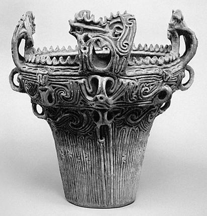 Во-вторых, они больше не довольствуются глиной как основным материалом. Ей на смену приходят железные и бронзовые изделия, появляются новые формы и виды предметов: мечи, колокола, зеркала. А глиняные сосуды начинают теперь обжигать при более высокой температуре, и они становятся более прочными и долговечными. Только вот выглядят они теперь гораздо проще, без огненных чаш и причудливых орнаментов. Так материковые технологии и знания пришли на смену яркой первобытной экспрессии.
