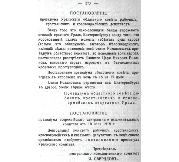 Я, конечно, ничего еще не слыхала. Сообщение из Екатеринбурга было получено только днем. Положение в Екатеринбурге было тревожное: к городу подступали белочехи, зашевелилась местная контрреволюция. Уральский Совет рабочих, солдатских и крестьянских депутатов, получив сведения, что готовится побег Николая Романова, содержавшегося под стражей в Екатеринбурге, вынес постановление расстрелять бывшего царя и тут же привел свой приговор в исполнение. Яков Михайлович, получив сообщение из Екатеринбурга, доложил о решении облсовета Президиуму ВЦИК, который одобрил постановление Уральского областного Совета, а затем информировал Совет Народных Комиссаров. В. П. Милютин, участвовавший в этом заседании СНК, так писал в своем дневнике: «… — Товарищи, Свердлов просит слово для сообщения. — Я должен сказать, — начал Свердлов обычным своим тоном, — получено сообщение, что в Екатеринбурге по постановлению областного Совета расстрелян Николай… Николай хотел бежать. Чехословаки подступали. Президиум ЦИК постановил одобрить…». Свердлова К. Т. (Новгородцева, супруга Я. М. Свердлова), Яков Михайлович Свердлов, 4-е изд., М.: Молодая гвардия, 1985, с. 366.