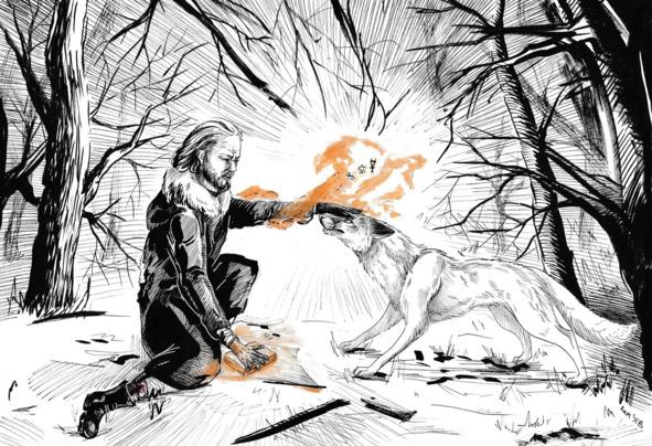 Путник произносил слова медленно, но с каждым разом всё громче и громче, словно он пытался достучаться до самой души волчьей. Его голос в этот миг звучал как раскат грома, исходящий от него к зверю, некая сила будто бы выбивала из животного всю злость. Он внимал, постепенно стал забывать о своей ярости, его глаза были сильно напряжены и взволнованы — будто бы волк узрел окружающий мир в новом свете, в свете человеческого понимания вещей. Стало заметно и то, что с того момента, как человек ухватил зверя за лоб и стал с ним говорить, вдоль его руки простёрлись странные, светящиеся жёлтым цветом символы. Казалось, это сияние было потоком духовной энергии, направленной к волку. Путник держал животное левой рукой, но знаки указывали на иной источник магии, исходящий от правой руки, а точнее, от предмета, которого она касается. То была толстая книга в шёлковом переплёте, который явно недавно был на неё наложен. При её использовании в общении со зверем предмет стал заметно светиться золотистым цветом, а неизвестная энергия переходила к путнику с ещё нераскрытых страниц книги. Что это была за сила — не ведал и сам человек, он лишь верил, что был хранителем великого знания, с коим предначертано совершать исключительно благие, добрые дела, несущие просвещение и целительный свет в сердца всех живых существ.
