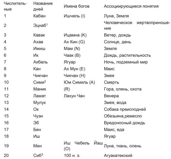 Для этих 360 дней у них есть 20 букв, или знаков, которыми их обозначают, оставляя без названия остальные пять, потому что они их считают роковыми и плохими. Это следующие буквы, и каждая из них будет иметь сверху своё название, как слышится, записанное нашими буквами.