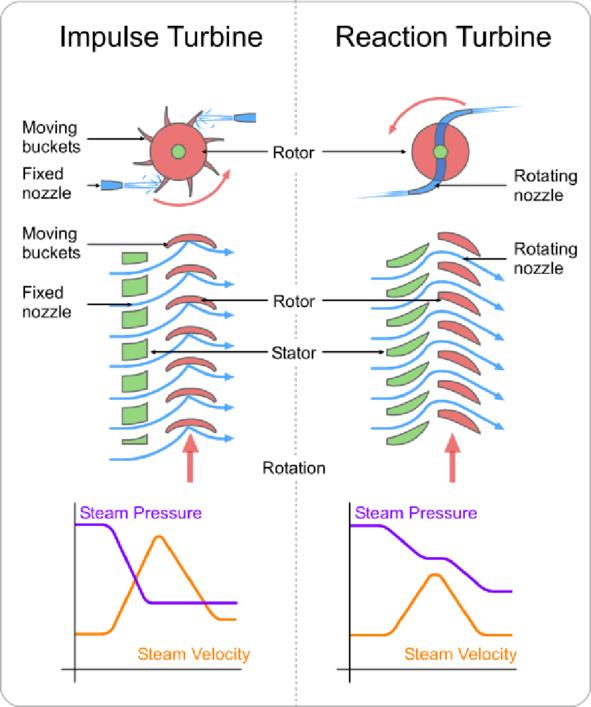 В зависимости от характера расширения рабочего тела различают активные и реактивные ступени турбины. В активных ступенях потенциальная энергия пара (газа) преобразуется в кинетическую только в сопловых аппаратах, и кинетическая энергия используется для вращения рабочих лопаток. В реактивных ступенях расширение рабочего тела начинается в сопловом аппарате и продолжается в каналах рабочих лопаток, имеющих конфигурацию реактивного сопла. Полезная работа совершается в активной ступени только вследствие изменения направления потока рабочего тела, а в реактивной ещё благодаря силе рабочего тела в межлопаточных каналах.
