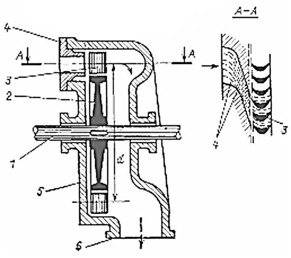 1 — вал; 2 — диск; 3 — рабочие лопатки; 4 — сопловая решётка; 5 — корпус; 6 — выпускной патрубок.