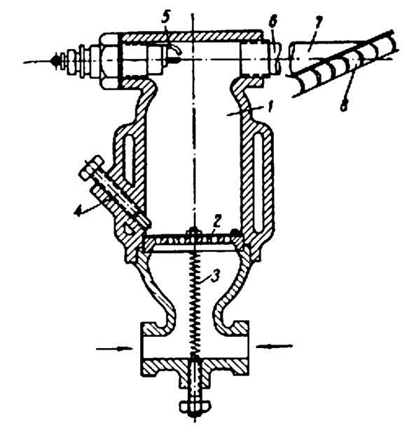 1 — камера сгорания; 2 — всасывающий клапан; 3 — пружина; 4 — регулирующий винт хода клапана; 5 — свеча; 6 — газоход; 7 — сопло; 8 — колесо турбины.