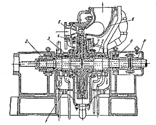 1 — нижняя половина корпуса; 2 — опорно-упорный подшипник; 3 — корпус уплотнения; 4 — рабочее колесо турбины; 5 — сопловый аппарат; 6 — верхняя половина корпуса; 7 — экран; 8 — опорный подшипник; 9 — муфта.
