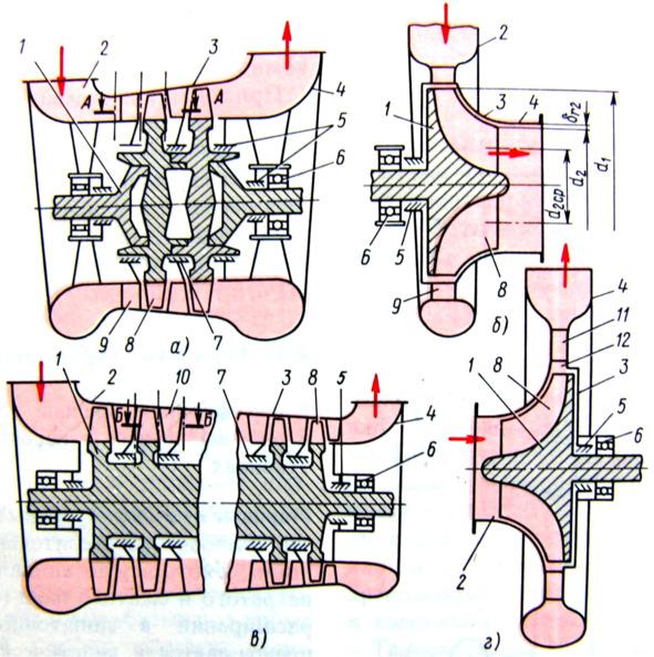 а — осевая турбина; б — центростремительная турбина; в — осевой компрессор; г — центробежный компрессор; 1 — ротор; 2 — входной патрубок (улитка); 3 — корпус; 4 — выходной патрубок (улитка); 5 — концевые уплотнения; 6 — подшипниковые узлы; 7 — промежуточные уплотнения; 8 — рабочая лопатка; 9 — сопловая лопатка; 10 — спрямляющая лопатка; 11 — лопаточный диффузор; 12 — безлопаточный диффузор.