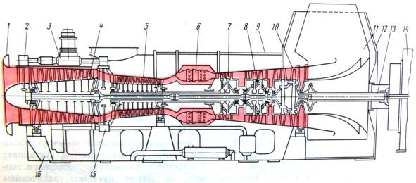 1 — воздухозаборник; 2 — передняя коробка привода; 3 — задняя коробка привода; 4 — КНД; 5 — КВД; 6 — камера сгорания; 7 — ТВД; 8 — ТСД; 9 — кожух двигателя; 10 — ТНД; 11 — газоотводный патрубок; 12 — кожух газоотводного патрубка; 13 — рессора; 14 — редуктор; 15 — маслоагрегат; 16 — рама.