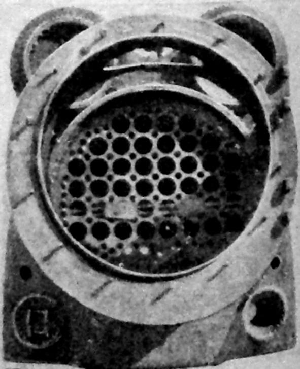 Обратный холодильник применён однако не оросительный, а поверхностный, т. е. нагретая в конденсаторе охлаждающая вода охлаждалась воздухом в поверхностном холодильнике. Это мероприятие хотя и вызывает опасения в смысле понижения экономичности (так как расход энергии на обратное охлаждение здесь может возрасти), но зато, с другой стороны, имеет ряд значительных преимуществ. При поршневом локомотиве и при турболокомотиве с обратным оросительным холодильником время следования поезда, вследствие расхода питательной, вернее охлаждающей, воды ограничивается несколькими часами.